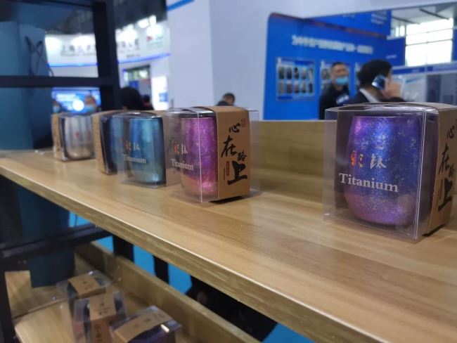 這就是鈦制作的杯子,鈦的特殊性質(zhì)使它氧化反應(yīng)后呈現(xiàn)出和彩虹一樣絢爛的色彩,而且無毒無害。它們在不同光下就會呈現(xiàn)出不一樣的顏色,這樣你每天都會有一個新顏色的杯子,心動了嗎?