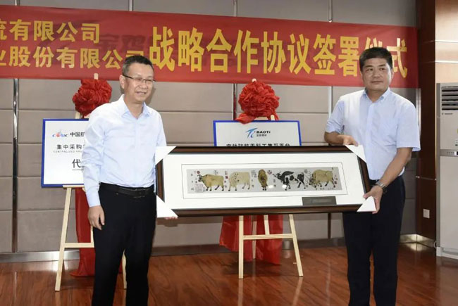 寶鈦集團黨委副書記、總經理,寶鈦股份董事長雷讓岐與航天物流有限公司黨委書記、董事長李沈軍為雙方代表室揭牌并互贈紀念品;寶鈦股份董事、副總經理張延生與航天物流有限公司副總經理張媛媛簽署戰略合作協議。寶鈦股份副總經理何書林主持儀式。