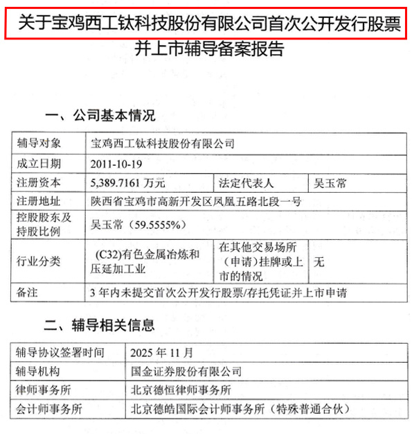 11月17日,證監會官網披露,寶雞西工鈦科技股份有限公司(以下簡稱“西工鈦”)正式啟動上市輔導程序,國金證券擔任輔導機構。