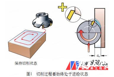 (2) 保持恒定的進給以避免工件的硬化,在切削過程中刀具要始終處于進給狀態,銑削時徑向吃刀量a e應為半徑的30%,如圖1所示。