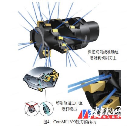 鈦合金加工的焦點是熱,大量高壓切削液要及時準確地噴射到切削刃上,才能夠快速地將熱量移除。山特維克可樂滿公司推出專門用于鈦合金加工的銑刀CoroMill 690,其結構如圖4所示。