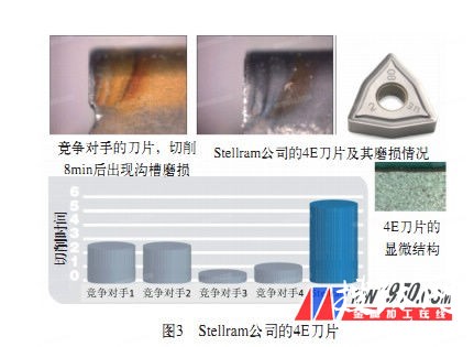 因此,鈦合金加工需要特殊的刀片材料和幾何形狀。例如,美國ATI集團旗下的Stel lram 公司就是一家難加工材料解決方案提供商,其1B和4E車削刀片具有微粒硬質合金基體和超硬納米TiAlN PVD涂層,牌號為SP0819,能保證在高溫鈦合金加工時減少積屑瘤的生成。其中IB用于Ti6Al4N鈦合金的精加工,4E用于粗加工和半精加工,4E刀片的特點和性能,如圖3所示。